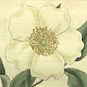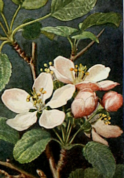 Apple blossoms can be easily confused with the flowers of single-blooming members of the Rose Family (Rosaceae). A few examples are shown above. Key characteristics of apples are that they grow on trees not bushes or non-woody small plants, that they produce apples as fruits, and they lack thorns. Their leaves are alternate and shaped like ovals with serrated edges. Apple blossoms have five petals and are produced in small clumps. Flower buds are pink becoming white on the face when fully open. That being said, individual flowers of the Rose Family illustrated on chintz and lacking leaves or other structures can be quite challenging to identify exactly.
