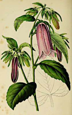 Campanula punctata (Spotted Bellflower) (published as Campanula nobilis) from C. Morren, ed., Annales de la Société royale d’Agriculture et de Botanique de Gand, vol. 3: t. 128, 1847