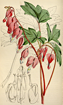 Lamprocapnos spectabilis (Bleeding Hearts) (published as Dielytra spectabilis) from Curtis’s Botanical Magazine, t. 4417-4485, vol. 75 [ser. 3, vol. 5]: t. 4458 (1849)