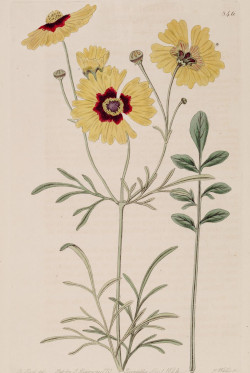 Coreopsis tinctoria (Tickseed) from The Botanical Register, 1824, vol. 10 pl. 846 provided by Oceancetaceen - Alice Chodura, Public domain, via Wikimedia Commons