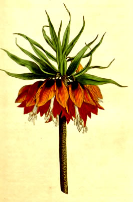 Description: Fritillaria imperialis (Crown Imperial Fritillaria) is a member of the Lily family (Liliaceae). The Hortus Kewensis, ed. 2, vol. 2 recorded that this native of Persia? was introduced to Britain about 1596.