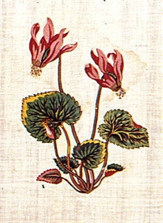 Description: Cyclamen sp. (Cyclamen) is a member of the Primrose Family (Primulaceae). The Hortus Kewensis, ed. 2, vol. 1 recorded that Cyclamen persicum, native to Cyprus, was introduced into cultivation in 1731. The Hortus Kewensis, ed. 2, vol. 1 also recorded that Cyclamen europaeum, native to Austria, was cultivated by 1596 and Cyclamen hederaefolium is a native of Britain. Cyclamen persicum is a likely model for the chintz motif given its publication in Curtis's Botanical Magazine more or less contemporaneously with the printing of the chintz.