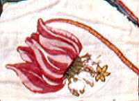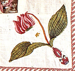 Erythronium dens canis (Dogtooth Violet) on the Unidentified maker, Broderie Perse Tree of Life Counterpane detail, 1790-1815. Cotton 96 1/2 x 92 1/2 in. Collection of Shelburne Museum. 1952-551.
