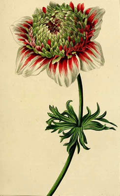Anemones were extremely popular with specialized plant breeders, then called florists, from the time of their introduction to Britain in the sixteenth century. Ruth Duthie comments in her book Florists' Flowers and Societies "When Furber's Twelve Months of Flowers appeared in 1730, anemonies were still popular; in the illustrations they are second in number to auriculas" (auriculas are the most frequently illustrated flower in that publication). Duthie also mentions "John Edwards, a muslin designer by trade, illustrated many florists' flowers in the British Herbal of 1770, including the anemone."* Double anemonies were one of the most frequently illustrated flowers found on quilts and chintz from the period from about 1775 to about 1850 as may be seen from the number and variety of motifs described on this multi-page set of examples of Anemone coronaria (Double Anemone).