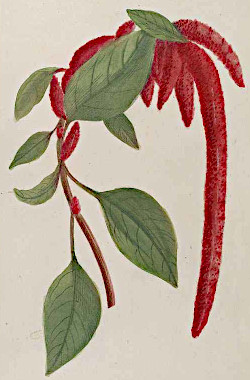 Description: Amaranthus caudatus cultivar Dreadlocks (Dreadlocks) is a member of the Amaranth Family (Amaranthaceae). The Hortus Kewensis, ed. 2, vol. 5, p. 277 listed Amaranthus caudatus as a native of the East Indies and as having first been cultured in Europe in 1596. This appears to be a natural variation of that species that may have been considered Amaranthus caudatus var. gibbosus or simply an unusual form of Amaranthus caudatus at the time the textile was printed. It is now recognized by modern plant growers as the cultivar Dreadlocks.