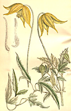 Clematis tangutica or C. orientalis (Golden or Oriental Clematis) (published as Clematis orientalis, var. tangatica from Curtis's Botanical Magazine, vol. 126, plate 7710, 1900