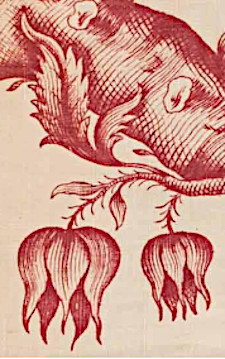 Clematis tangutica or C. orientalis (Golden or Oriental Clematis) from the Colonial Williamsburg Foundation, Horse and Fox Copperplate-Printed Textile, c 1770