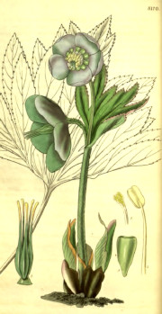 Description: Helleborus sp. (Hellebore) is a member of the Ranunculus family (Ranunculaceae). There are about 20 species and most are toxic. The Hortus Kewensis, ed. 2, vol. 3 lists six species, two of which (H. viridis and H. foetidus) are native to England, with the others originating in Europe and North America.