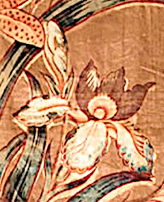 Description: Iris ensata (Japanese Water Iris) is a member of the Iris Family (Iridaceae). Iris ensata (formerly Iris kaempferi) this native of Japan, China, Korea, and Russia and was introduced to European cultivation about the mid-19th century.* This identification is tentative because the date of the chintz fragment appears to preceed introduction of the plant to European cultivation. The chintz design may have been based on an early unidentified botanical illustration, an imported Japanese porcelain or painting, or may have been based on an unidentified closely related Iris in the subgenus Limniris. However the similarity of the chintz design to Iris ensata is striking.