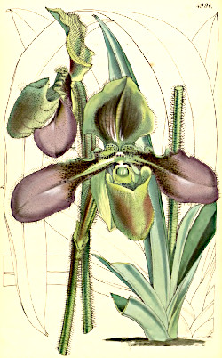Paphiopedilum hirsutissimum (Lady Slipper Orchid), published as Cypripedium hirsutissimum (Villous Lady's Slipper), Curtis's Botanical Magazine, vol. 83, plate 4990, 1857