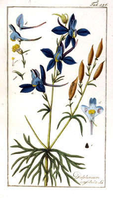 Consolida regalis (Larkspur) from J. Zorn and D.L. Oskamp, Afbeeldingen der artseny-gewassen met derzelver Nederduitschen en Latynsche beschryvingen, vol. 4, t. 456, (1800).
