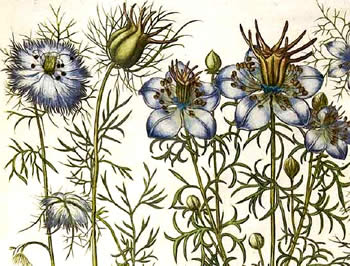 Nigella sp. (Nigella) (then called Melanthium Hispanicum majus) from Basillius Bessler, Hortus Eystettensis, vol. 2: Secundus ordo collectarum plantarum aestivalium, plate 178, fig. I, 1620