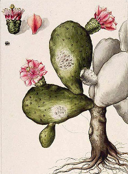 Opuntia cochenillifera (Prickly Pear) Public Domain image from the Torner Collection of Sessé and Mociño Biological Illustrations, courtesy of the Hunt Institute for Botanical Documentation, Carnegie Mellon University, Pittsburgh, Pa. While not necessarily the plant illustrated on the textile, this plant was selected as an example because it is the host species for cochineal insects. They are the source of cochineal dye, a very important dye for early textile manufacturers.