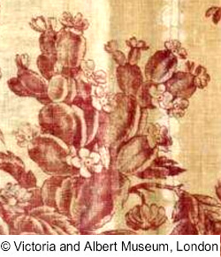 Description: Opuntia sp. (Prickly Pear) is a member of the Cactaceae (Cactus) family. The Hortus Kewensis, ed. 2, Vol. 3 recorded this native of Peru was first cultivated in Europe in 1690. Curtis's Botanical Magazine, Vol. 1, plate 17 recorded it as a native of South America and the West Indies. Note that the flower on the textile design above is more similar to that of an Orchid Cactus than of that of a Prickly Pear though the plant is clearly a Prickly Pear. Textile designers did not always have botanical training and sometimes took artistic license when creating their designs.