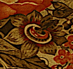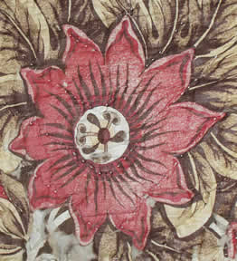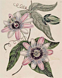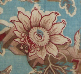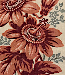 Description: Passiflora sp. (Passion Flower) is a member of the Passion Flower Family (Passifloraceae). The Hortus Kewensis, ed. 2, vol. 4 recorded twenty-eight species of Passion Flower native to the West Indies, Jamaica, Bahamas, Vera Cruz, Mexico, Brazil, Martinique, Curassao, Cayenne, New Calidonia & Norfolk Island, Virginia, and America. Today we recognize around 550 species, mainly from tropical regions of the new world, but with a few species from Asia, the United States, and Oceania. The large number of species and artistic license tends to make most illustrations of passion flowers on textiles extremely difficult to recognize as specific species. Winged-stem passion flowers and blue passion flowers are somewhat easier to recognize and a few examples can be tentatively identified as red passion flowers or a similar species. In a few cases highly stylized examples are even difficult to recognize as passion flowers. This webpage lists and in several cases provides illustrations of examples that can be clearly recognized by most as passion flowers, but can't be identified further.