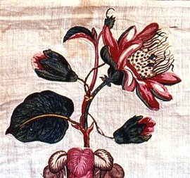 Passiflora alata (Winged-stem Passion Flower) on the Unidentified maker, Broderie Perse Tree of Life Counterpane detail, 1790-1815. Cotton 96 1/2 x 92 1/2 in. Collection of Shelburne Museum. 1952-551.
