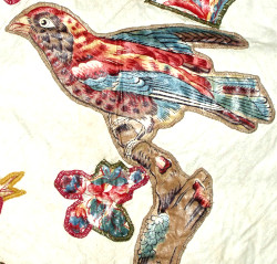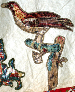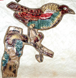 Foliose Lichen motifs (probably Flavoparmelia caperata (Common Greenshield Lichen)) including tree stumps and birds from the same Private Collection, Irish Chintz Applique coverlet, c. 1840