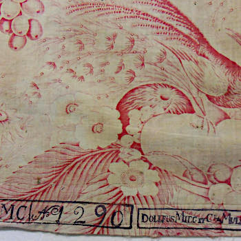 The back of a piece of Zipélius Bird on Bowl of Fruit fabric showing Dollfus-Mieg et Cie Factory Mark, Musée d'impression sur étoffes, inv.S. 631.6, c. 1840