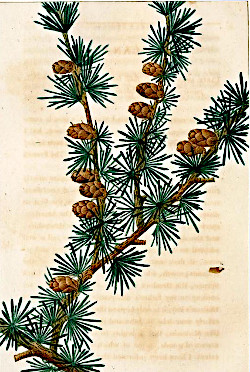 Larix laricina (Black Larch) from François André Michaux, North American Sylva, vol. 3, plate 153, 1819 (François André Michaux (book author), Augustus Lucas Hillhouse (translator), Bessa (illustrator), Gabriel (engraver), Public domain, via Wikimedia Commons)
