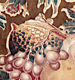 Description: Cucumis melo (Melon) is a member of the Cucurbi Family (Cucurbitaceae). The Hortus Kewensis, ed. 2, vol. 5, p. 345 did not provide an origin location and botanists are still trying to determin where it originated. The melons shown on textiles from 1750 to about 1850 vary widely in appearance and many more cultivars have been developed since that time.
